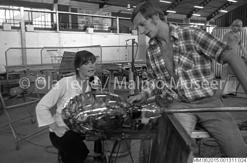 • Eva Englund med glasblåsare i hyttan på Orrefors glasbruk, 1974.