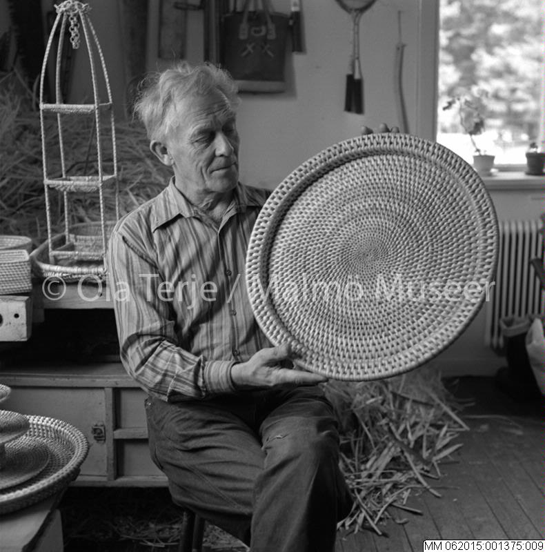 • Träslöjdaren Nils Jonasson med flätat fat i verkstaden i Vitteryd, Moheda 25/4 1970.