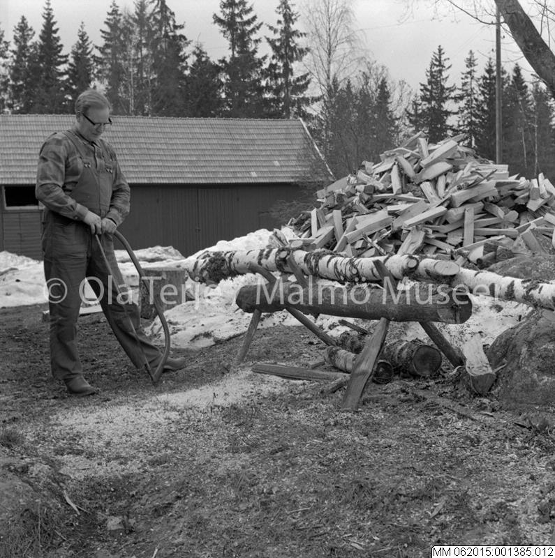 • Träslöjdaren Edvin Karlsson med såg och björketrä i Hästmahult, Gullabo 21/4 1970.