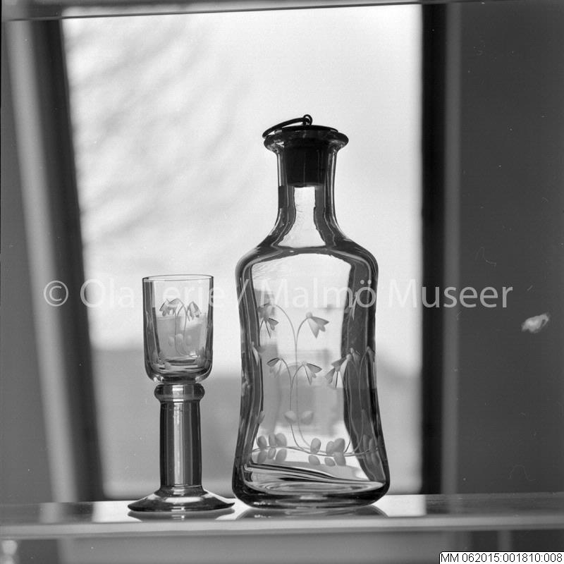 • Glaskonst, graverat snapsglas och flaska, Boda Glasbruk 1970.