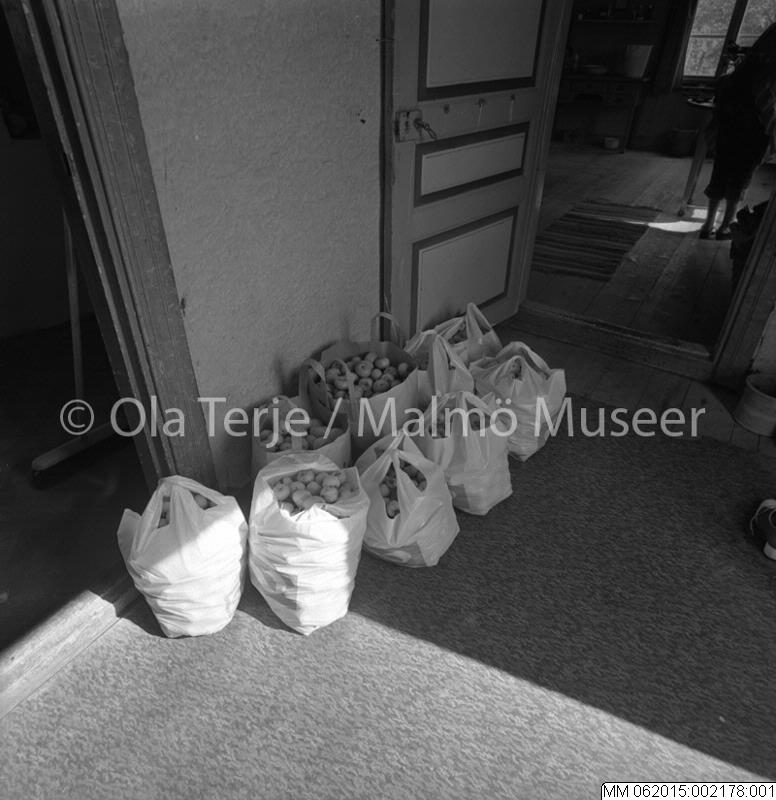 • Äppelskörd i kassar, i stugan i Alsjökulla, september 1969.