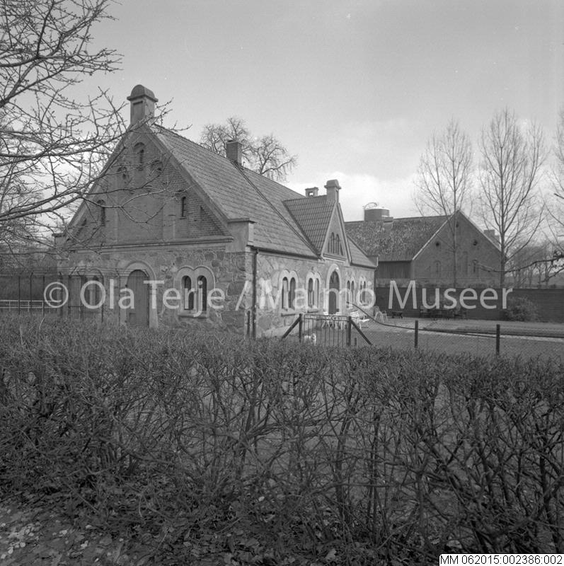Exteriör av ekonomibyggnad tillhörande Hyby slott. Bilderna beställda av professor Sten-Åke "Stånke" Nilsson, konstvetenskapliga institutionen i Lund, för ett bokprojekt om 1800-talets ombyggnader och renoveringar. Hyby, 860403.