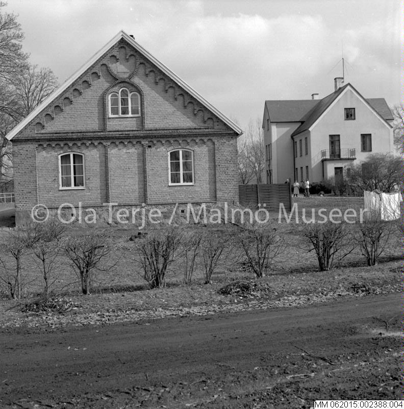 Exteriör av bostadshus tillhörande Hyby slott. Bilderna beställda av professor Sten-Åke "Stånke" Nilsson, konstvetenskapliga institutionen i Lund, för ett bokprojekt om 1800-talets ombyggnader och renoveringar. Hyby, 860403.