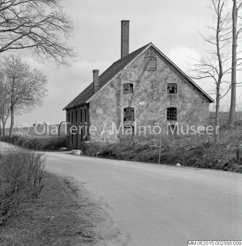 Exteriör av ekonomibyggnad tillhörande Hyby slott. Bilderna beställda av professor Sten-Åke "Stånke" Nilsson, konstvetenskapliga institutionen i Lund, för ett bokprojekt om 1800-talets ombyggnader och renoveringar. Hyby, 860403.