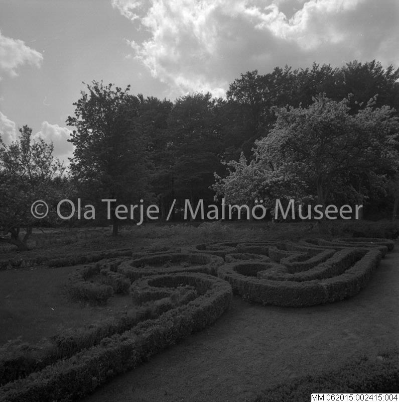 Exteriör från Kulla Gunnarstorps slott, trädgården. Bilderna beställda av professor Sten-Åke "Stånke" Nilsson, konstvetenskapliga institutionen i Lund, för ett bokprojekt om 1800-talets ombyggnader och renoveringar. 860528.