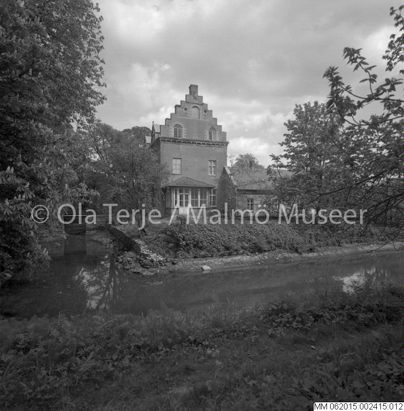 Exteriör från Kulla Gunnarstorps slott, med vallgraven. Bilderna beställda av professor Sten-Åke "Stånke" Nilsson, konstvetenskapliga institutionen i Lund, för ett bokprojekt om 1800-talets ombyggnader och renoveringar. 860528.