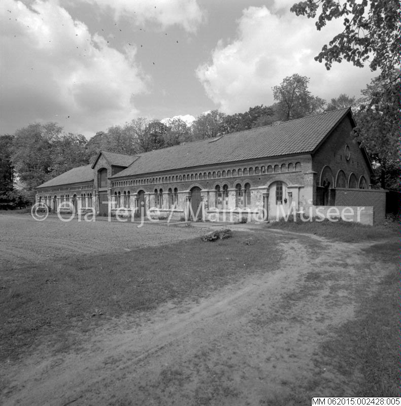 Exteriör från Öja herrgård vid Ystad, ekonomibyggnader. Bilderna beställda av professor Sten-Åke "Stånke" Nilsson, konstvetenskapliga institutionen i Lund, för ett bokprojekt om 1800-talets ombyggnader och renoveringar. 860530.