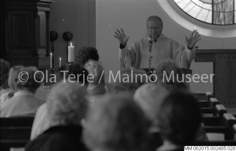 • Mässa i Kirsebergs kyrka, prästen Ingemar Thorin välsignar församlingen. Malmö 840603.