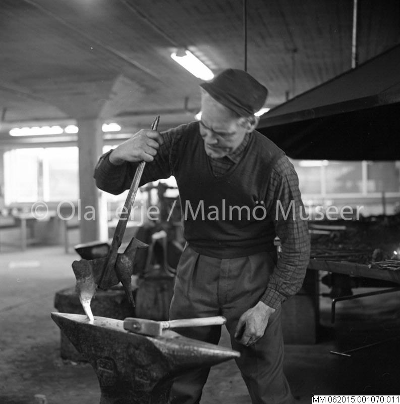 • Mästersmeden Axel Strömgren vid städet i smedjan i Boda, 641109.