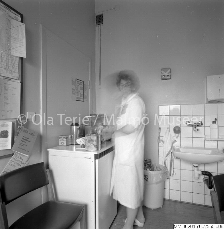 • Onkologiska Kliniken vid Lunds Lasarett. Dokumentation av lokaler och verksamheter. 1988. Undersköterskan Margit i kafferum.
