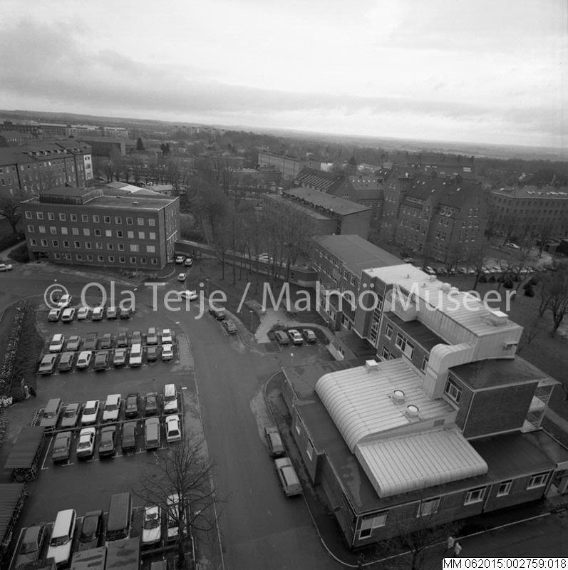 • Ögonkliniken vid Lunds Lasarett. Dokumentation av verksamhet och lokaler. 1990. Lunds Lasarett sett uppifrån.