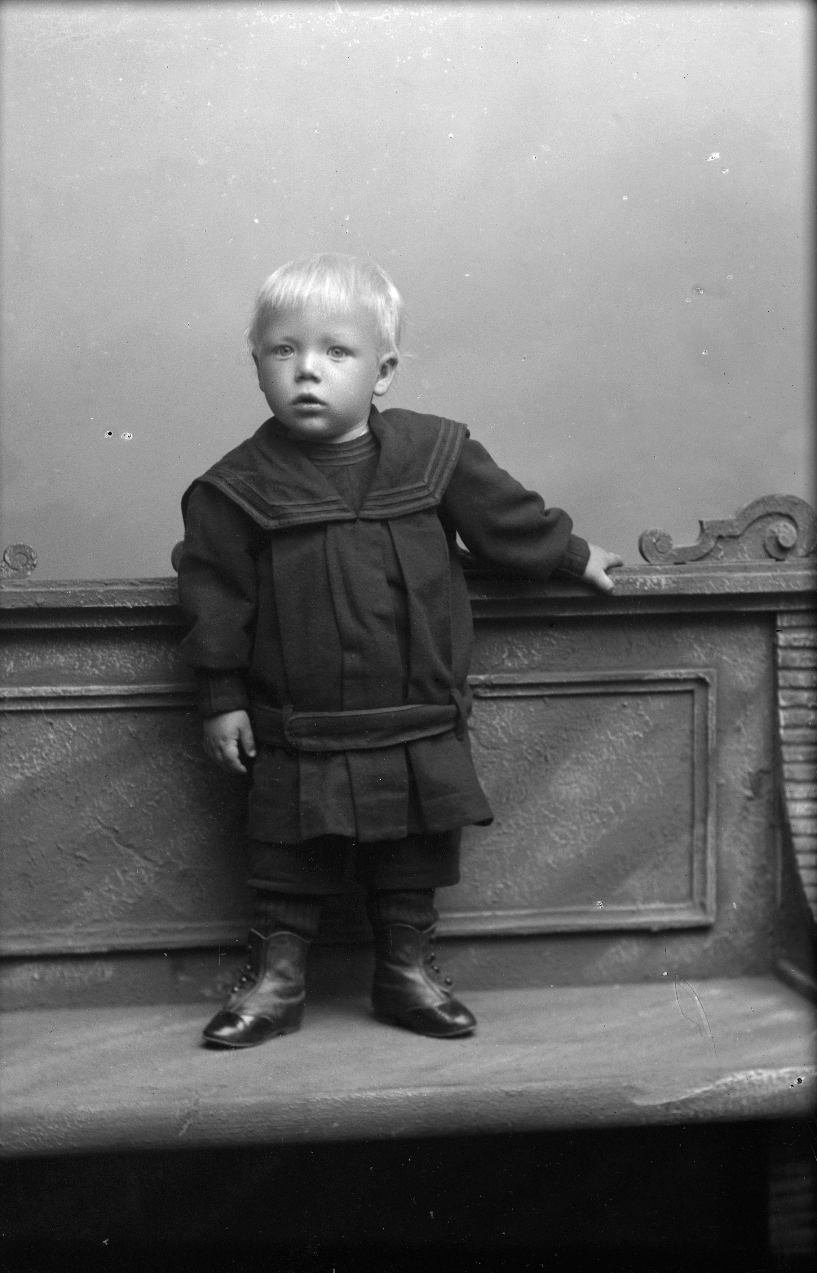 • Porträtt i helfigur av Gerda Hanssons son, klädd i sjömanskostym, stående på bänk.