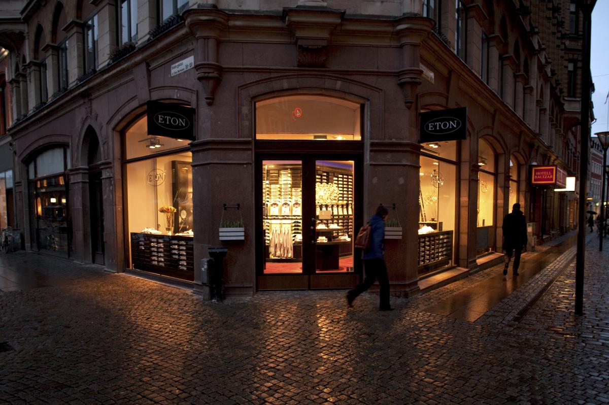 Hörnet aav Baltzarsgatan 45 och Södergatan. Ekiperingsaffären Eton.Tidigare namn: Baltzarsgatan 45_Södergatan-0585-2