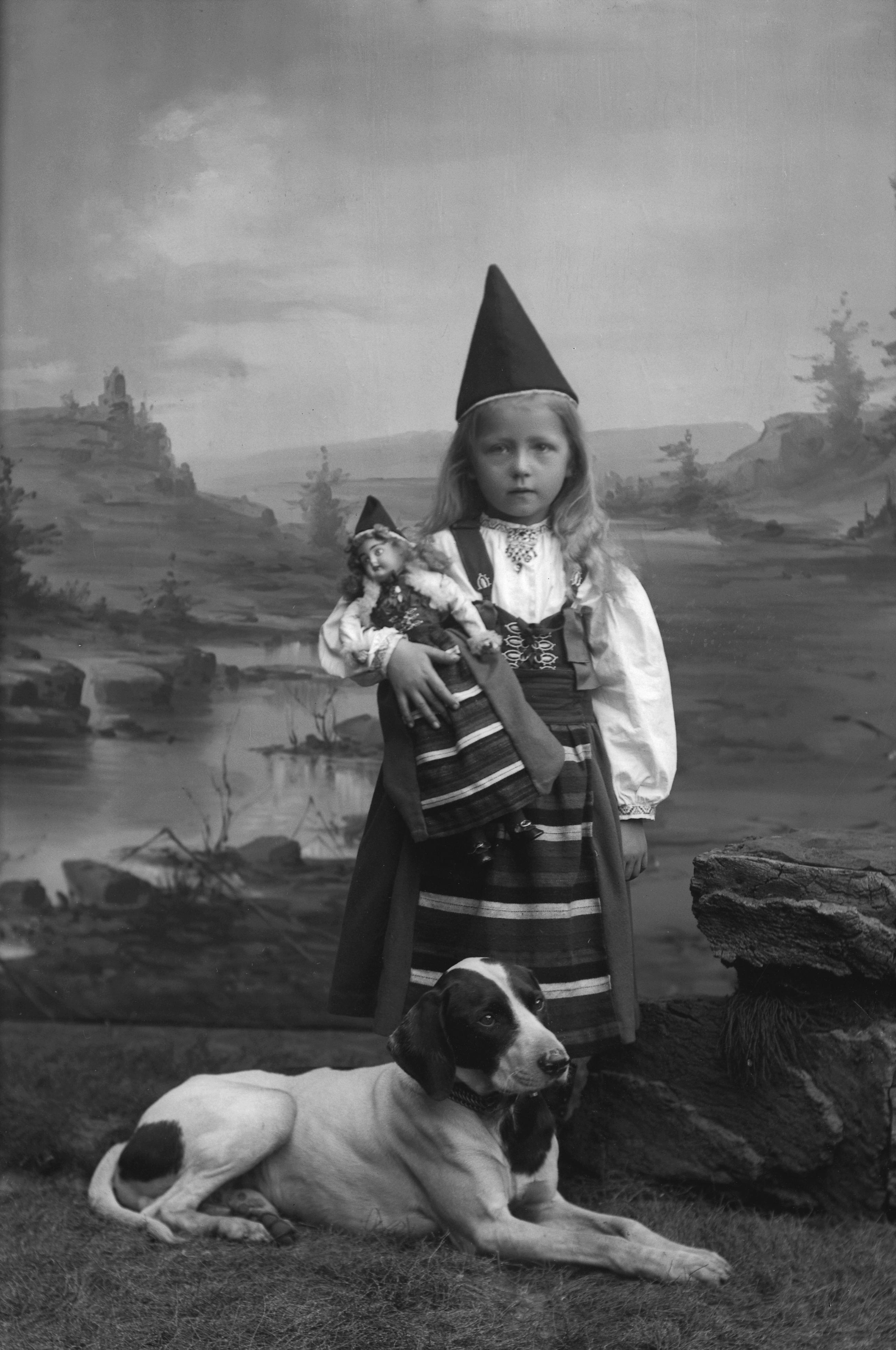 • Porträtt i helfigur av herr Petterssons dotter, iklädd folkdräkt och hätta, hållande docka med samma klädsel. Fotograferad framför ateljéfond.
