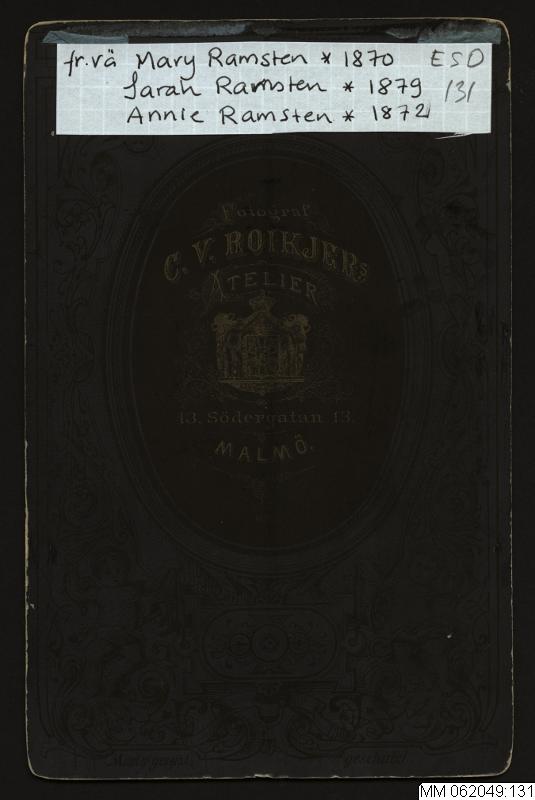 • Systrarna Ramsten, från vänster Mary, Sarah och Annie. Fotoateljé, 1882-1883.