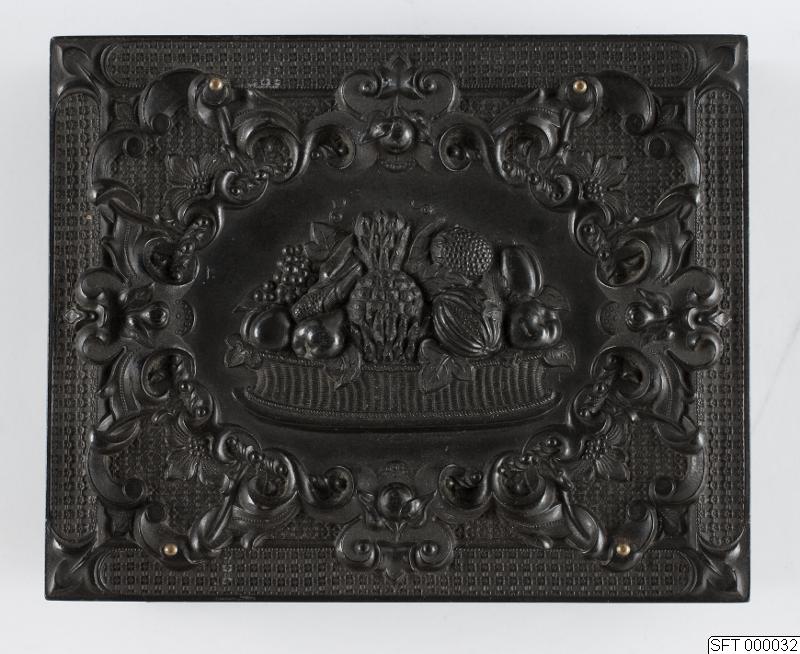 • Två kolorerade porträtt i fint etui. Den ena bilden föreställer en kvinna i halvfigur med två barn. Den andra bilden föreställer en man, halvfigur.