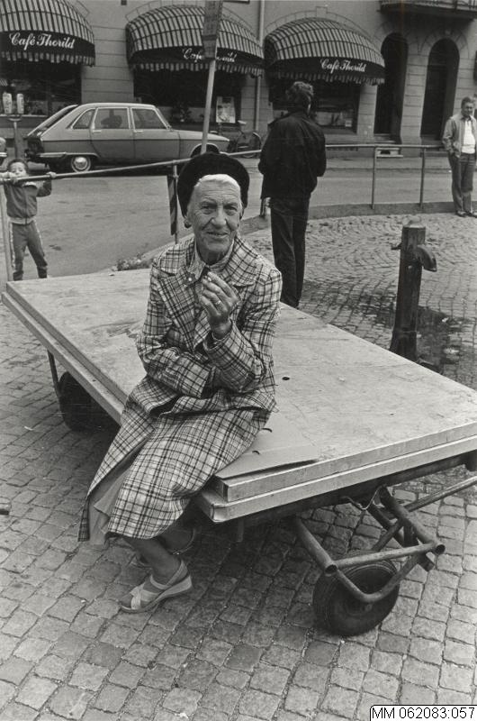 • Rökande kvinna sittande på ett lastflak, Simrishamnsgatan i bakgrunden.