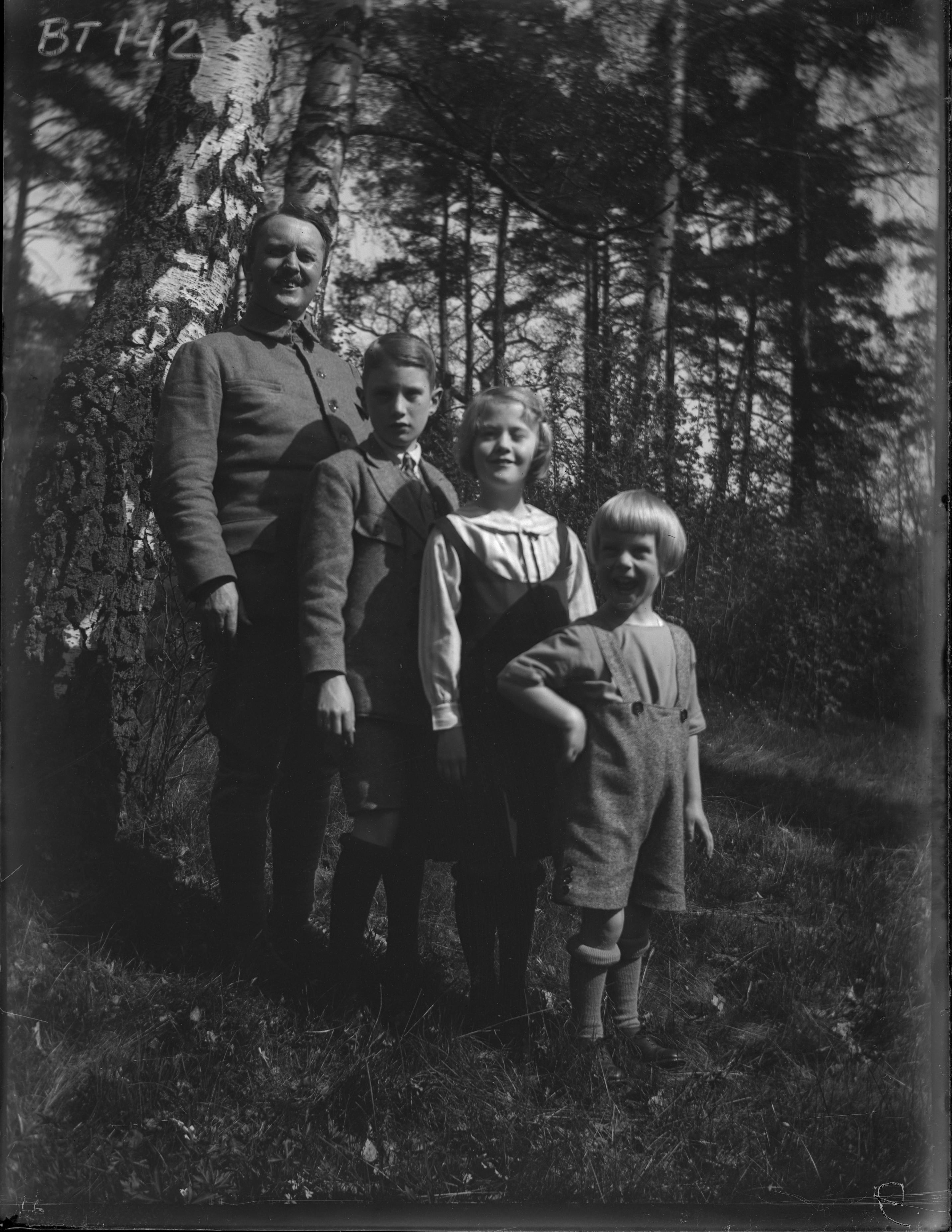 Omkring 1910? En man med tre barn i skogen. Tidigare nummer: BT 142.