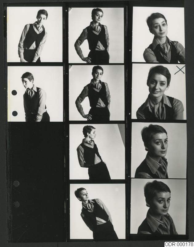 • Porträtt. Kvinna i kortklippt frisyr, klädd i tröja och kjol.