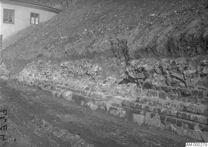 Utomhusbild som visar Malmöhus, västra vallgångsmuren.1944.