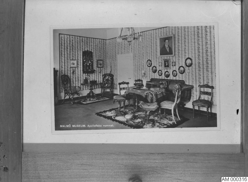 Repro: Appollska rummet. Soffa; bord med duk, matta, stolar tavlor med mera.1944.