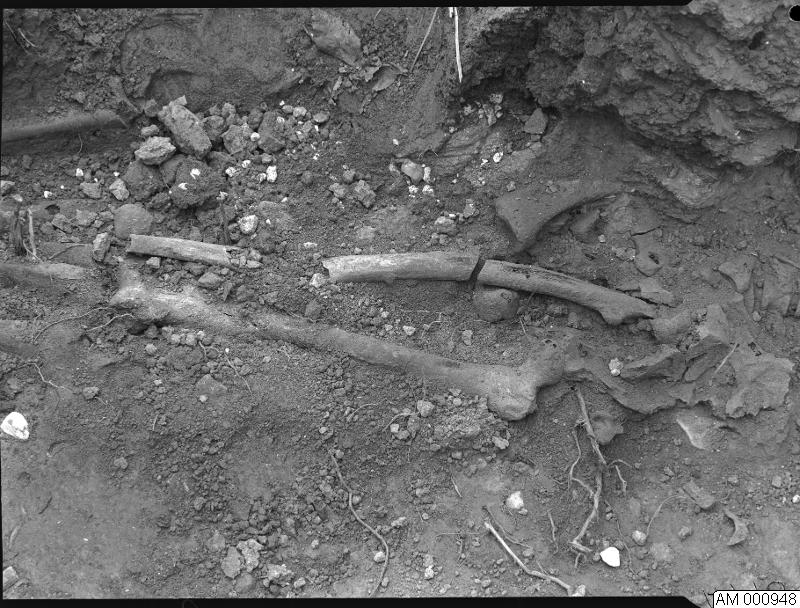 En bild som visar grävningsfoto, gravfynd skelett.1954.