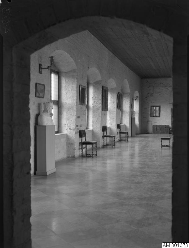 Inomhusbild som visar Malmö museum, Riddarsalen. Norra väggen. Fönsterrad, tavlor, stolar och en kista. 1955.