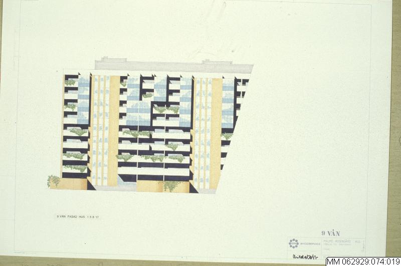 • Ritning på fasaden till hus på Rosengård. Jfr. bild 12. Enligt påskrift 1985-95.