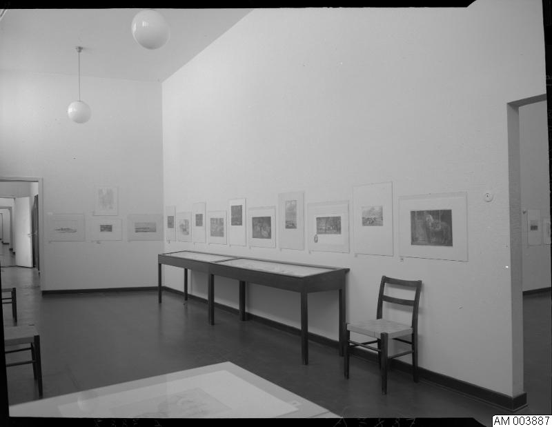 Inomhusbild som visar tillfälligt utställning av Hjalmar Asp. Teckningar och målningar. Montrar och stolar. 1960.