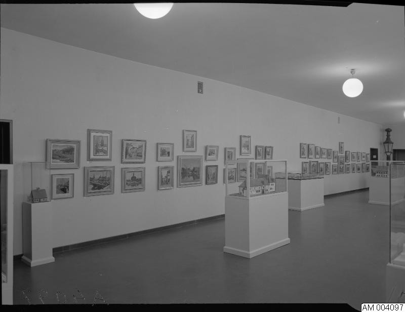 • Bild som visar Malmö museum, tillfällig utställning C.O Larsson 1957. Tavlor och glasmontrar.