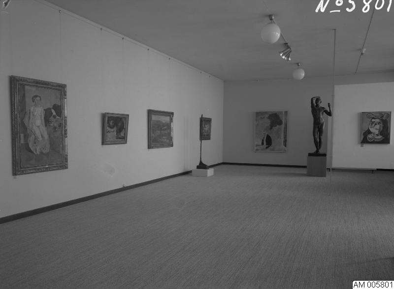 Bild som visar utställning nationellt museum 30 juni - 4 juli 1966. 100 år. Tavlor, en skulptur och en staty.Foto taget 1966 på Malmö museum.