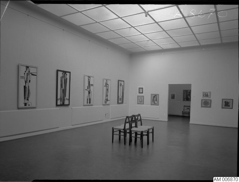 • Bild som visar Otto G. Carlsund, tillfällig utställning, Malmö museum 13 april - 11 maj 1969. Tavlor, stolar.
