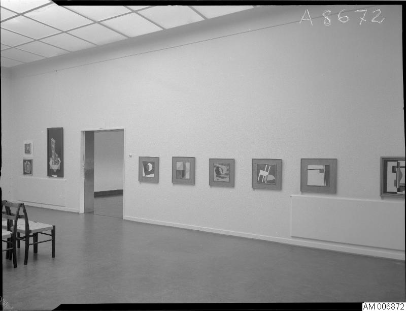 • Bild som visar Otto G. Carlsund, tillfällig utställning, Malmö museum 13 april - 11 maj 1969. Tavlor, stolar.