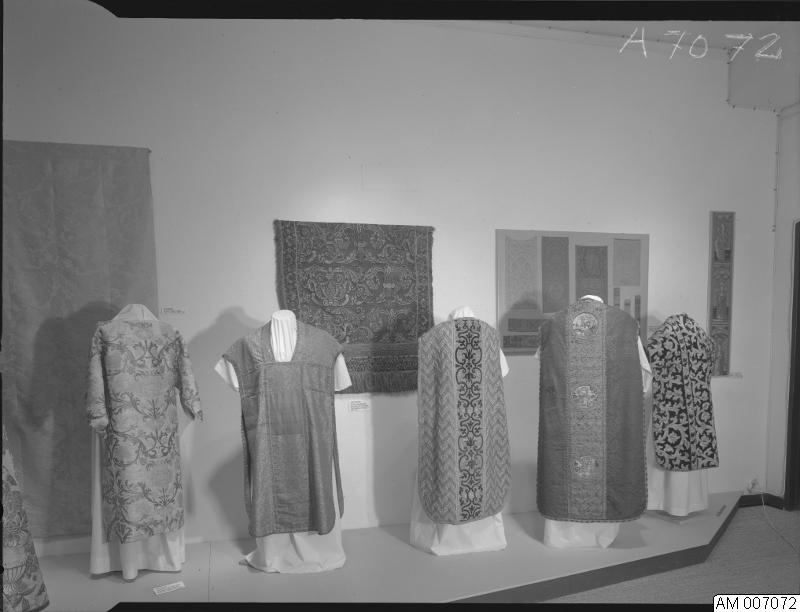• Bild som visar äldre kyrkliga skrudar, tillfällig utställning, Malmö museum, mars 1968. Textilier med mera ut museets samlingar.