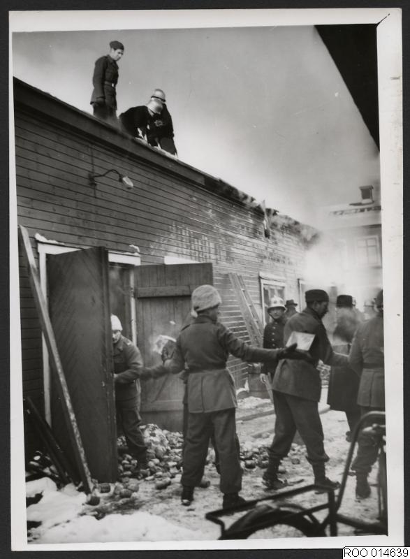 brandman, eldsläckningsarbete, 1940-tal, brandmän, brand, fabrik, militär, eldsvådor, fabriker, eldsvåda, installationsartiklar, bränder, 1943, värmeledningsmaterial, malmö, räddningsarbete, järnhardt, brandkår, carlsgatan, militärer