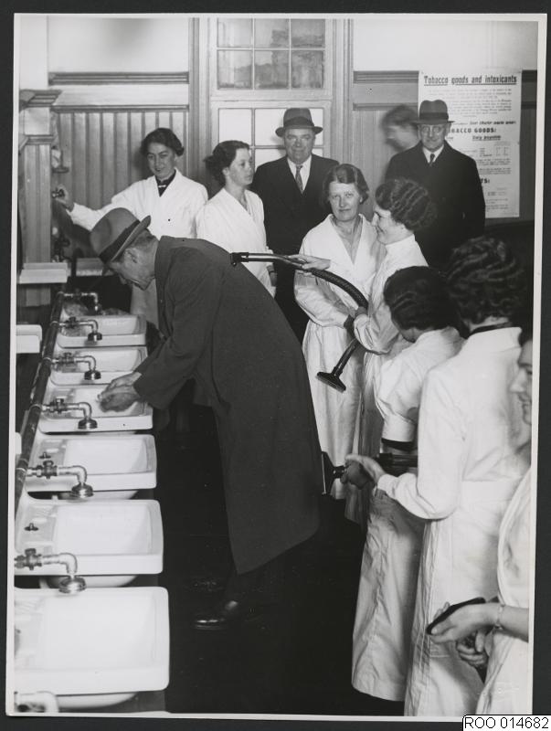 • Inomhusbild som visar kampen mot mul- och klövsjukan. Vid framkomsten till Malmö tvättas och dammsugs resenärerna från Danmark.