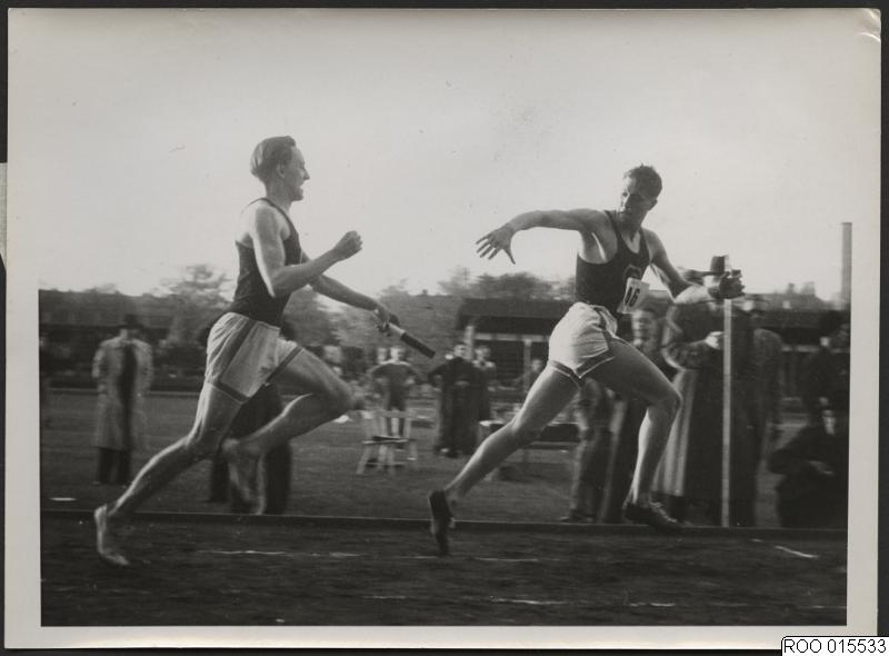 • Utomhusbild som visar premiär på Kolstybben. Fredstafetten. Lennart Strand och Karl Lund vid sista växlingen.