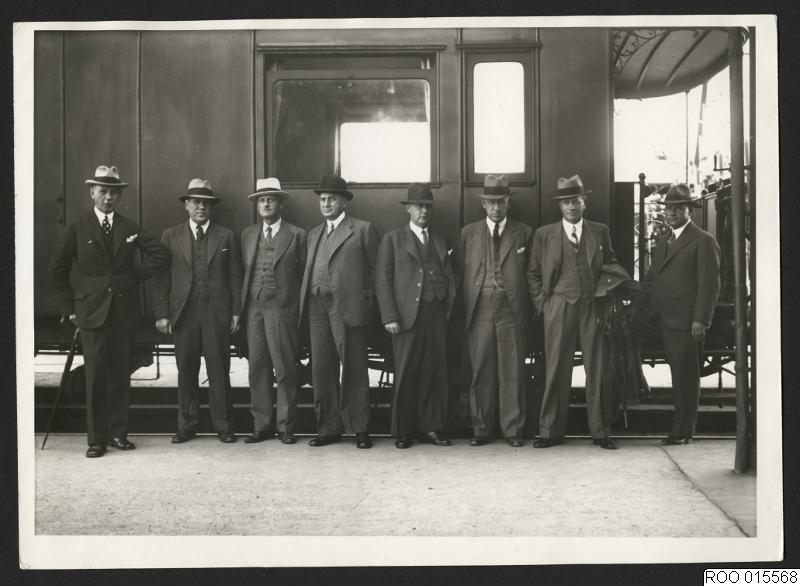 • Utomhusbild som visar en berest järnvägskommision. Från vänster: trafikinspektör Linderlöf, maskiningenjör Insulander, trafikchef Nilsson, baningenjör Ohnell, maskiningenjör Bayer, inspektör Paulsson.