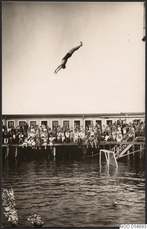 brygga, tävling, plattformskant, simhoppare, bryggor, publik, svikthopp, simhopp