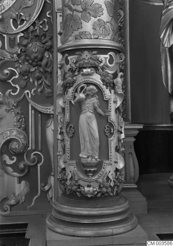 • Bild som visar Malmö, Sankt Petri kyrka. Altaruppsats. Väster sida, pelarbas. Ormbärande kvinna. Figur.