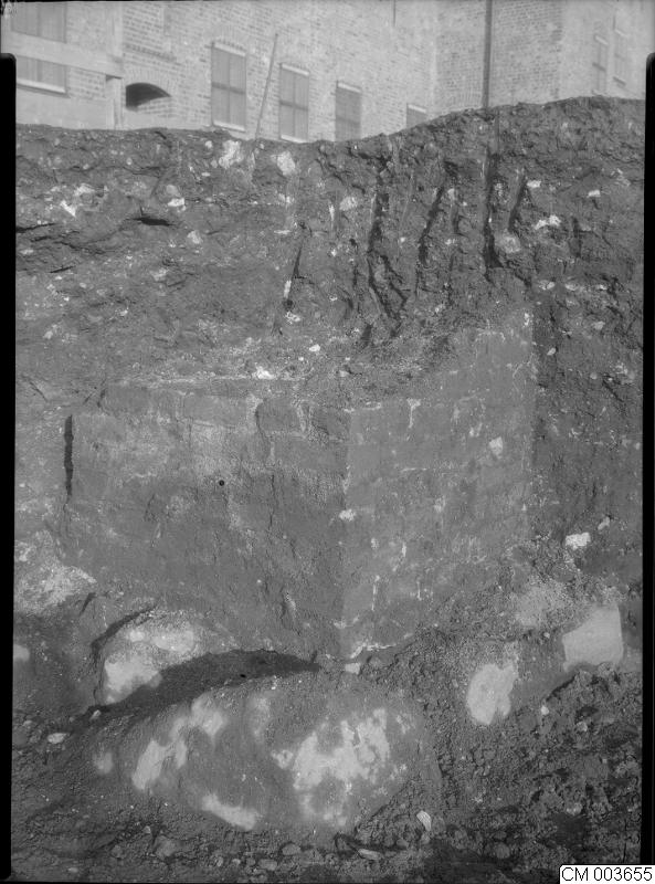 Slottsholmen, Malmö utgrävningsarbeten 1934 -1937. Bild som visar Västra längan, nordöstra schakthörnet, stenpelare.1934.