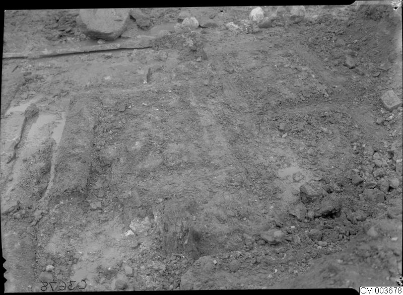 Slottsholmen, Malmö utgrävningsarbeten 1934 -1937. Bild som visar västra längan. Schaktbotten med bädd för stenkistan.1934.