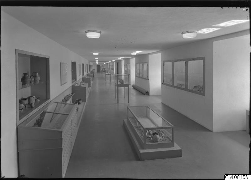 Bild som visar Malmö museum, Malmöhistoriska samlingarna. Glasmontrar och hyllor med ett skelett, krukor och andra föremål. 1946.