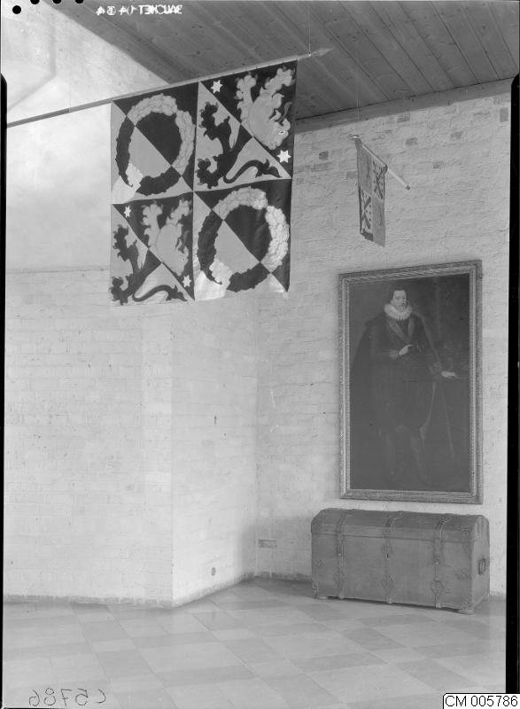 • Bild som visar Malmö museum. Tillfällig utställning, Einar Kedja. Riddarsalen. En flagga, ett porträtt och en förvaringskista. Mars-april 1950..