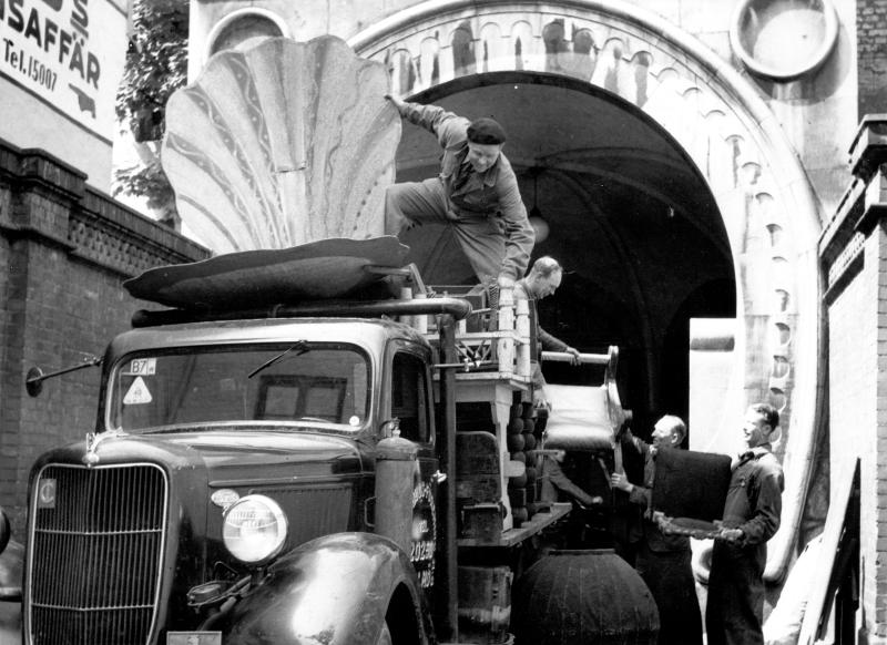 Gammal rekvisita till ny teater. Hippodromteaterns rekvisita, som direktör Winge samlat under 35 år, har förvärvats till Malmö nya teater. Rekvisitan omfattar en halv miljon dräkter och uniformer, över ettusen par skor och stövlar m.m. Bilden visar avflyttningen från gamla Hippodromteatern.