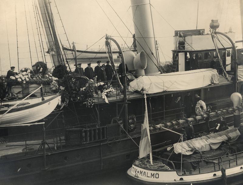 folksamlingar, stoft, förolycka, folksamling, man, hemförd, män, krans, svensksund, kanonbåtar, båtar, fartyg, hav, expeditioner, hms, kanonbåt, båt, kransar, förolyckade, expedition, andré
