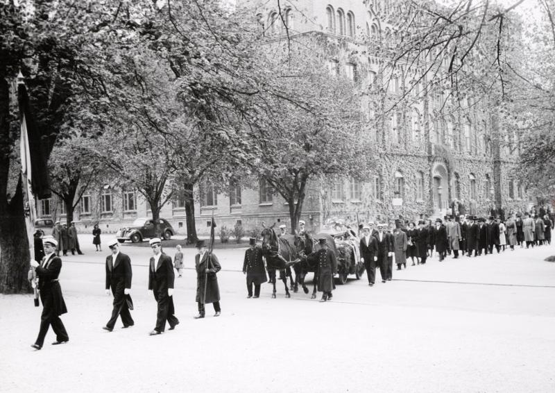 • Intendent Karlins begravning. Från Intendent G J:son karlins jordfästning i Lund. Bilden visar processionen, när den lämnar Kulturen på väg till Domkyrkan, där den högtidliga akten ägde rum.