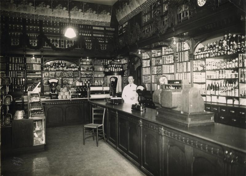 affär, man, sötsaker, kassaapparat, diversehandel, affärsbiträde, alkohol, handel, jul, våg, interiör, juldekoration, män