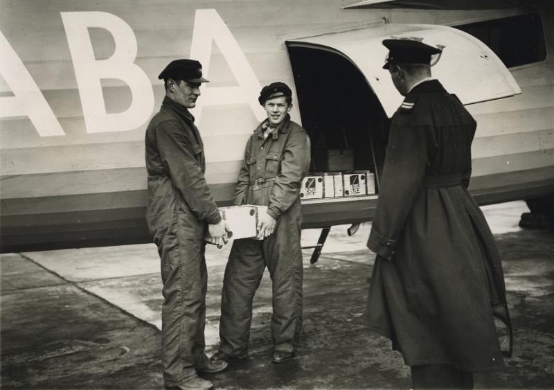 • Dyrbar flygtransport. 435 kg guld instuvas i "Lappland" för att transporteras till Paris. Bilden visar instuvningen av guldet å Malmö Flygstation.