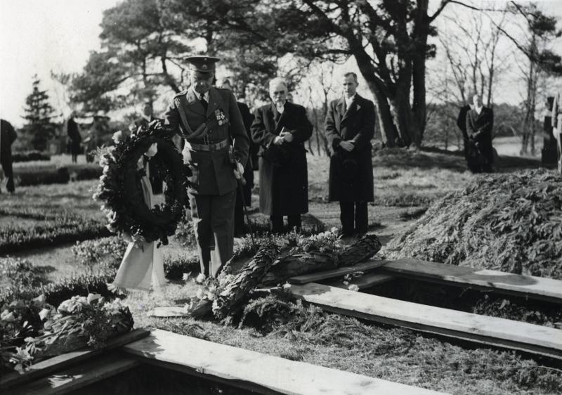 • Tysk militärbegravning i Sövde. De vid det tyska flygplanets beskjutning i Sövde omkomna båda tyska flygarna jordfästes på onsdagen i Sövde kyrka. Bilden visar överstelöjtnant Gyllengam nerlägger kransar från Ystads Fe??
